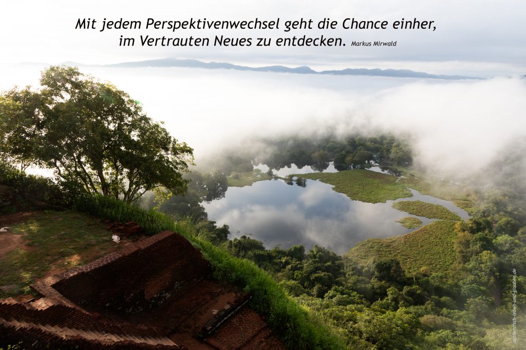 Unser Foto zeigt einen Blick vom Löwenfelsen, der 200 m aus der Umgebung herausragt. Für mich ein Bild, hin und wieder aus einer höheren Perspektive auf das eigene Leben und den Alltag zu schauen, um Neues zu entdecken, darüber zu staunen und dankbar zu sein.